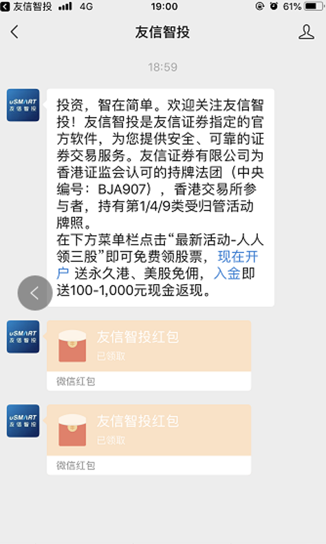 现金奖励:首次成功入金后,以现金券的形式发到友信智投APP“个人中心-奖励中心”,点击立即使用,前往微信服务号“友信智投”绑定友信账户,现金将以微信红包的方式发到您的微信账户;